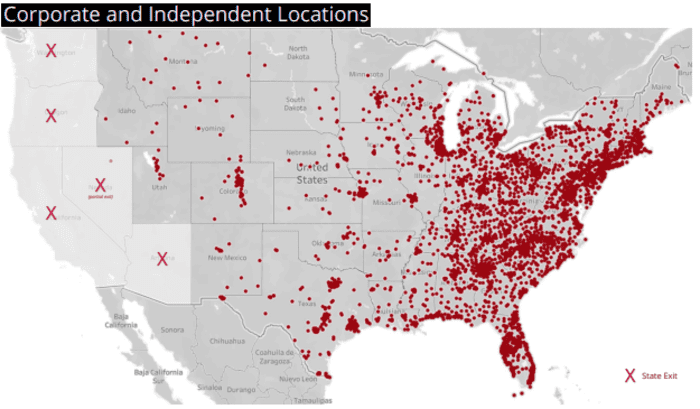 Many other news sources have covered these closures but none have information on which stores will close. The only information available at this time is a graphic MarketWatch got from Advanced Auto Parts. It shows a full exit from 5 western states including California. We looked through the legal filing by AAP and couldn't find the map graphic.